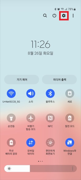 1. 핸드폰 화면을 위에서 아래로 내려서 톱니바퀴 아이콘 클릭합니다