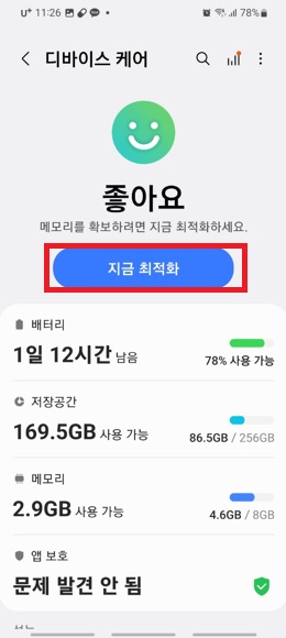 2. ‘디바이스 케어’ 혹은 '배터리 디바이스 케어' → ‘지금 최적화’ 클릭합니다